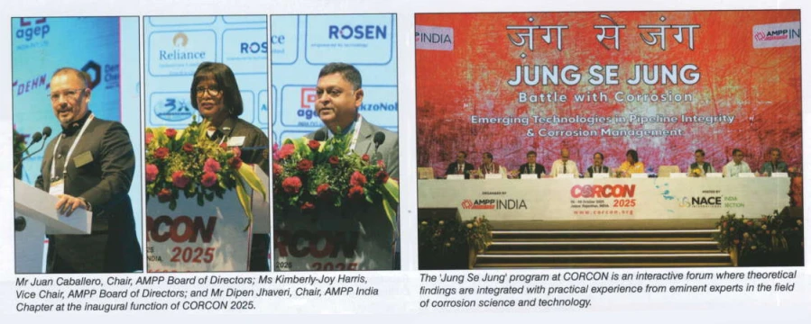 “Our nation is building infrastructure at an unprece dented pace! India plans to spend nearly Rs 143,000 crore on infrastructure between the years 2024 and 2030. The Union Budget of 2025-26 alone has marked a record Rs 11.21 lakh crore, which is around 3.1% of our GDP. This is towards capital investment in infrastructure alone. Over the last decade, capital expenditure on infrastructure has grown five fold, and by 2050, India will require around US$2.4 trillion in urban infrastructure investments,” said Mr Dipen Jhaveri, Chair, AMPP India Chapter. He was speaking at the inaugural function of CORCON 2025 at the Jaipur Exhibition and Convention Centre, on October 6, 2025. “These facts make one thing clear, that as India builds more pipelines, refineries, petrochemical units, steel plants, power plants and fertilizer units, more water systems and urban infrastructure, the demand for robust corrosion protection technolo-gies have never been greater.”